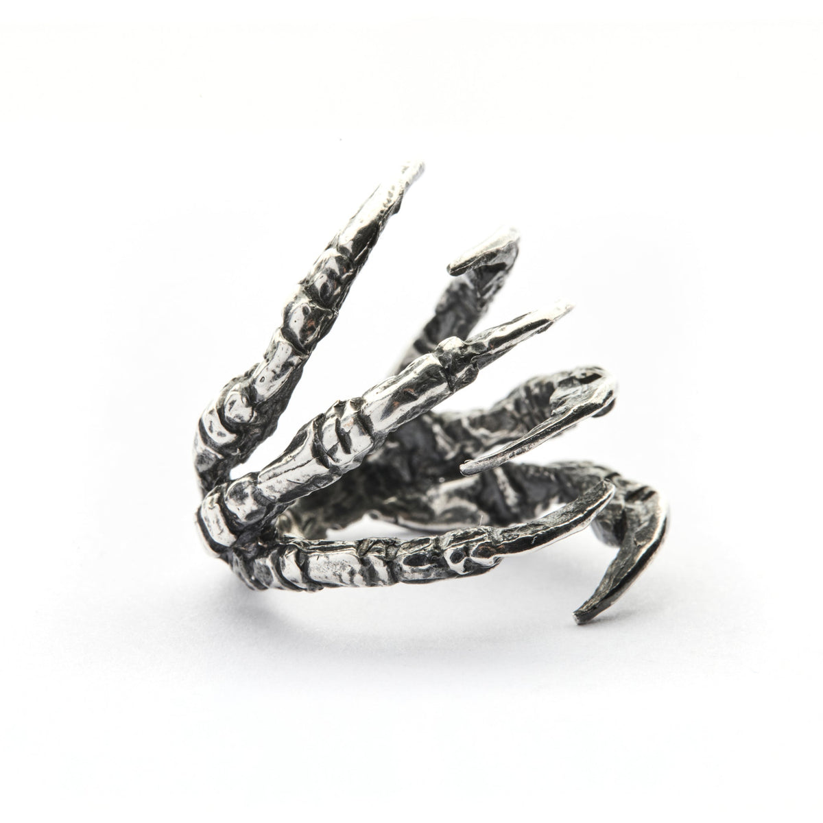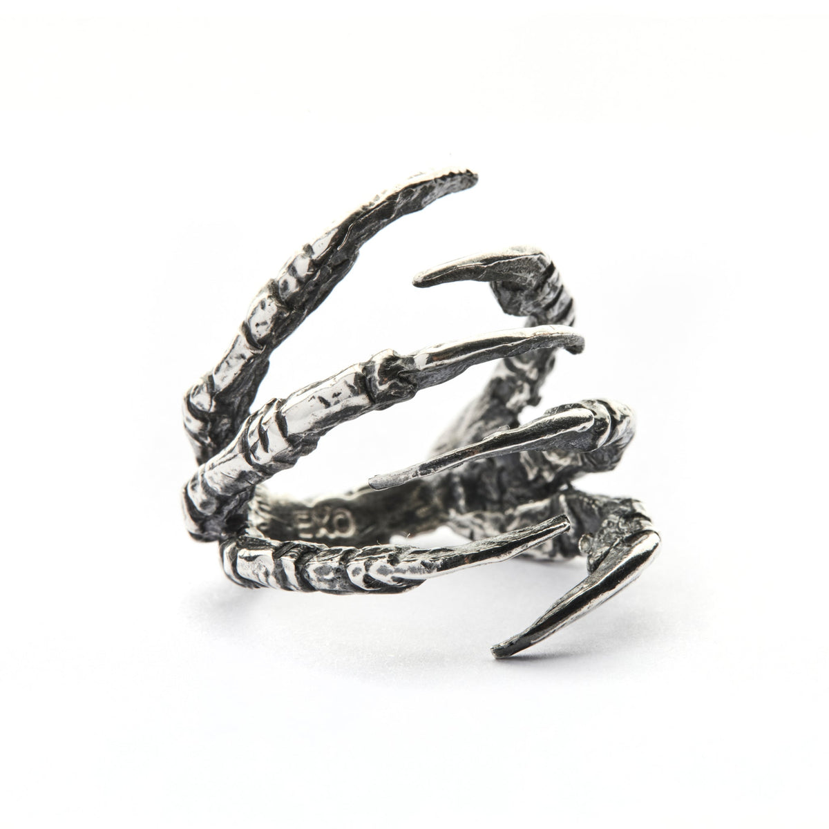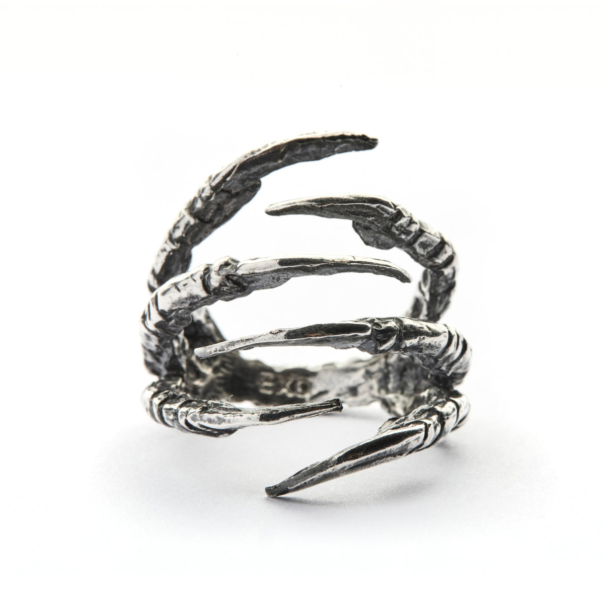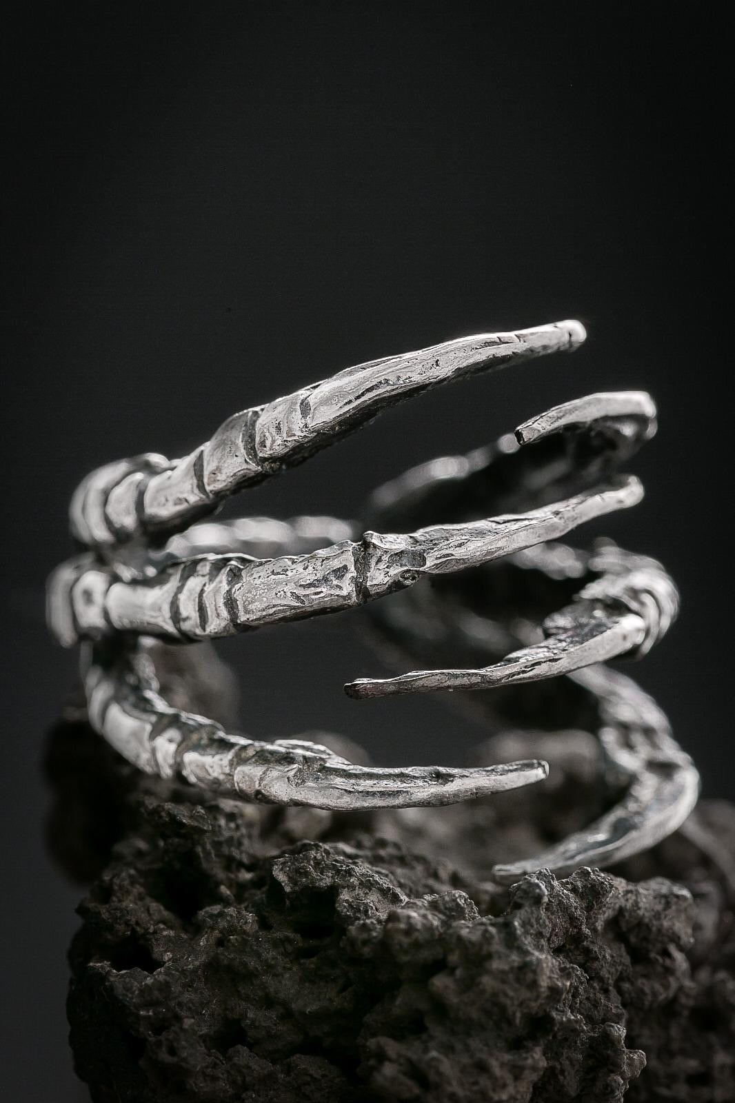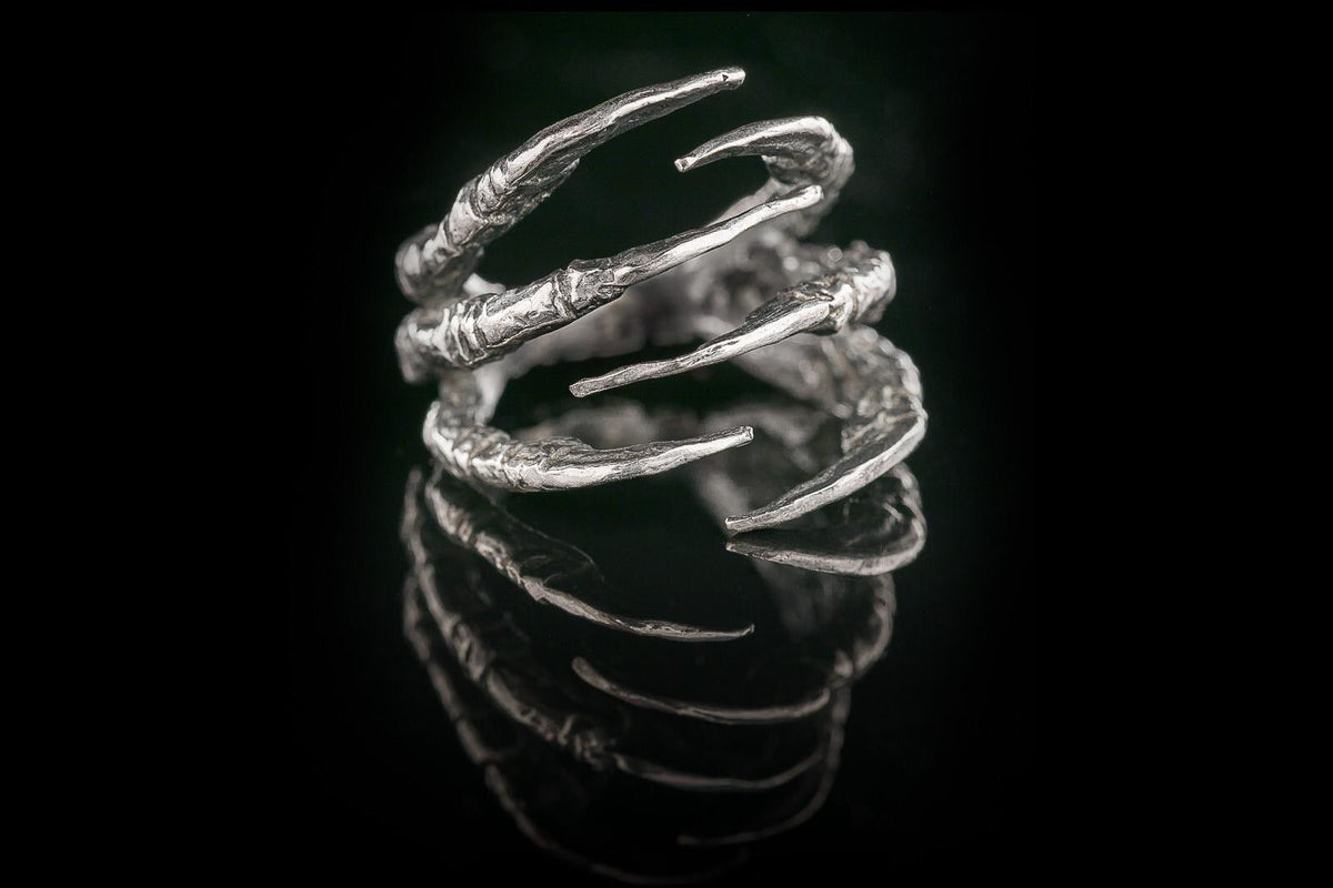 Geri dönüştürülmüş bronz döküm üzeri mikron gümüş kaplama, doğal döngüsünü tamamlamış karga pençesinden kalıp alınıp ayarlanabilir yüzüğe dönüştürülmüştür. Pençeleri vurgulayan antik patine ile tamamlanmıştır. İkili pençeler İskandinav mitolojisinde atıfta bulunulan bir çift kuzgunu sembolize eder. Odin'in müjdecileri Huginn ve Munnin akıl ve ruhu temsil eder.