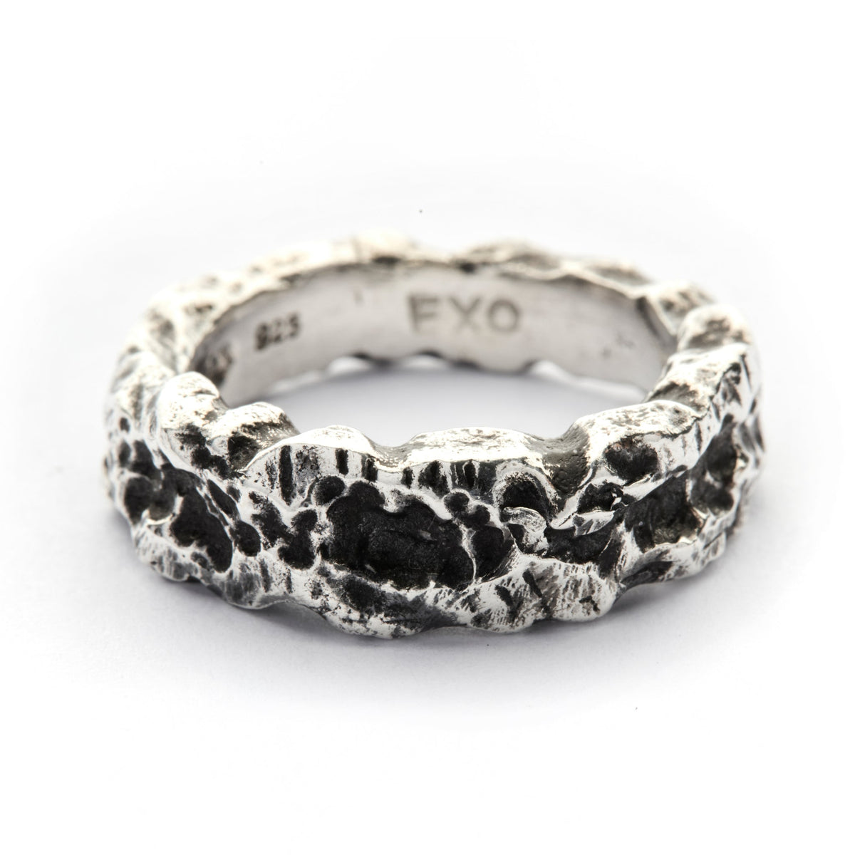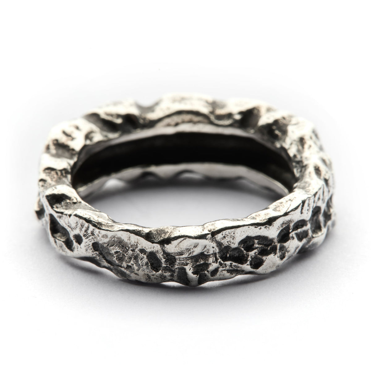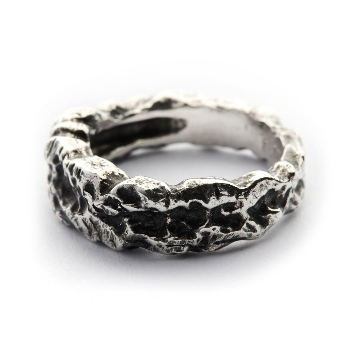 Geri dönüştürülmüş bronz döküm mikron gümüş kaplama, kayıp mum tekniği ile elde şekillendirilmiş lav dokulu tılsımlı yüzük. Yüzüğün tasarımı, suda soğuyan erimiş lavın dönüştürücü hallerinden esinlenmiştir. Organik heykelsi şekli, dönüşüme izin vermenin akışkanlığını ve uyarlanabilirliğini yansıtıyor.