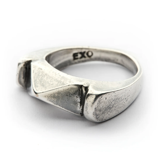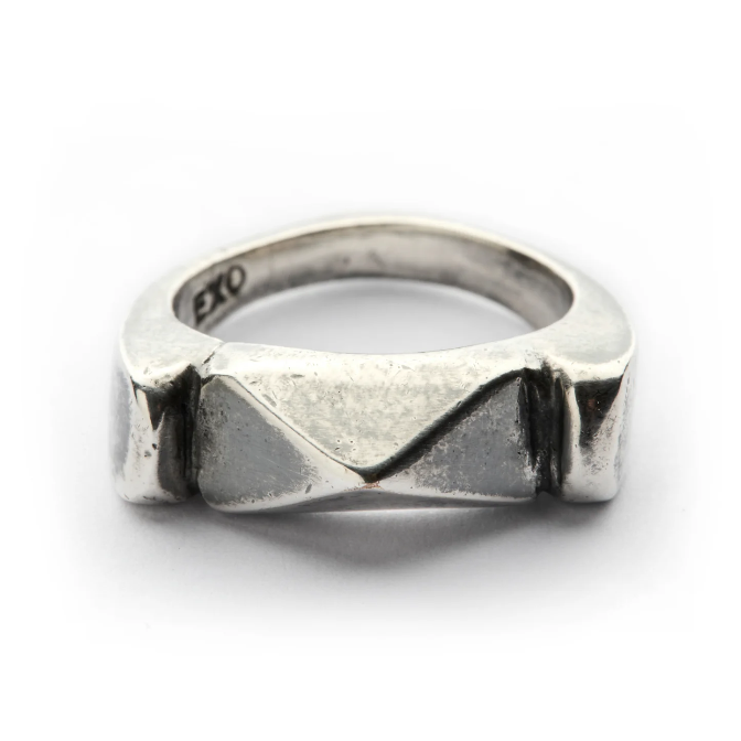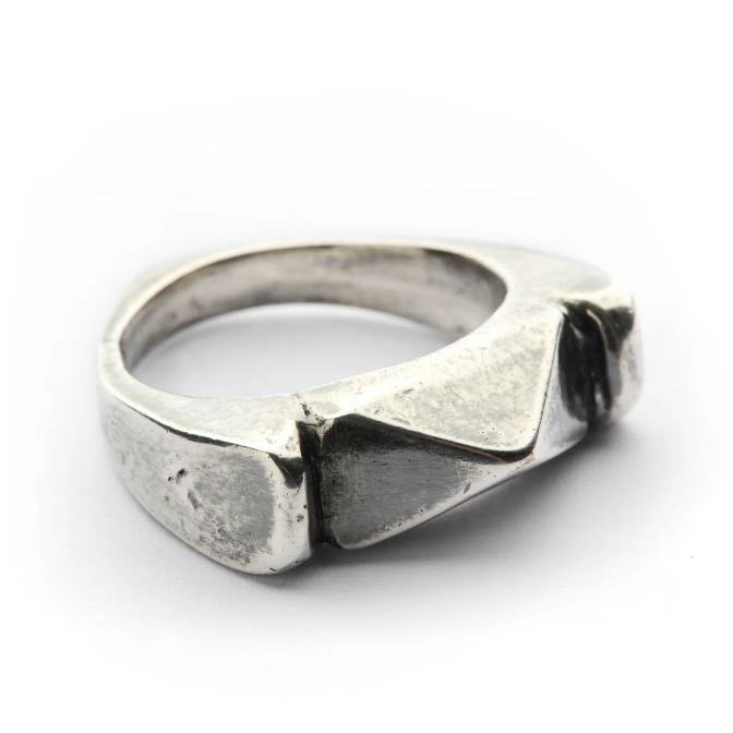 Geri dönüştürülmüş bronz döküm üzeri mikron gümüş kaplama, el oyması/kayıp balmumu tekniği, antika kubik yüzük. Bu yüzük TETRAD'dan esinlenmiştir ve maddenin dört formunun yanı sıra tezahür kavramını da sembolize eder.