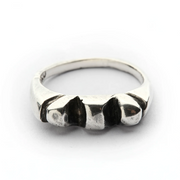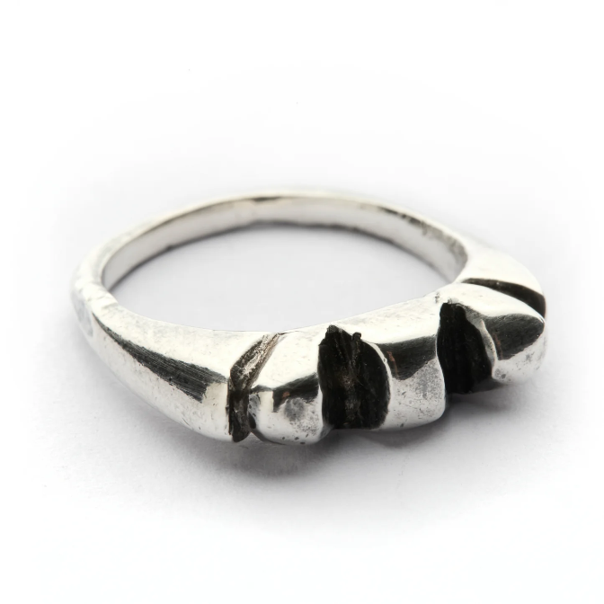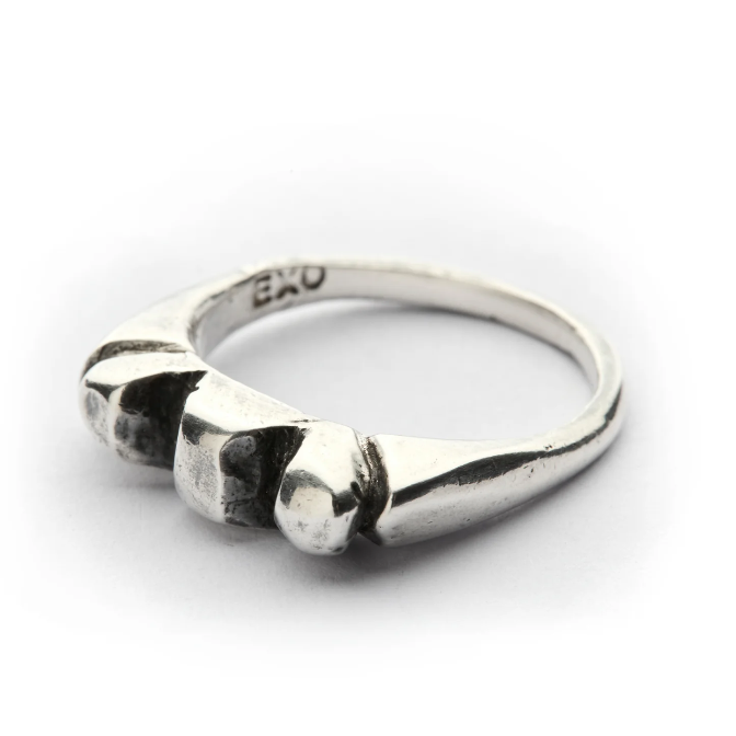 Geri dönüştürülmüş bronz döküm üzeri mikron gümüş kaplama, el oyması/kayıp balmumu tekniği, antika yüzük. Bu yüzük zihin, beden ve ruhun uyumunu temsil eden TRIAD'dan esinlenmiştir.